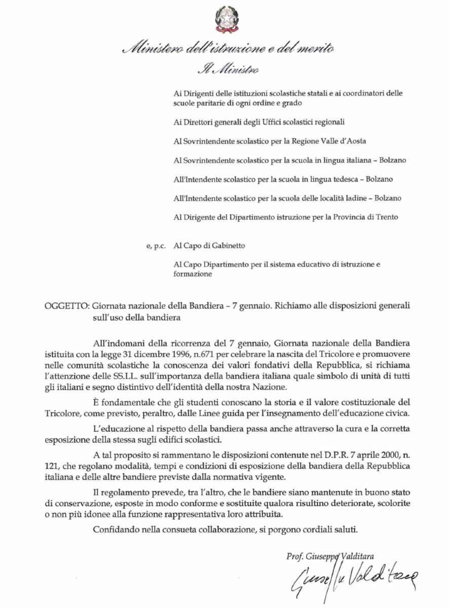 Bandiera tricolore a scuola: la nota del Ministro Valditara
