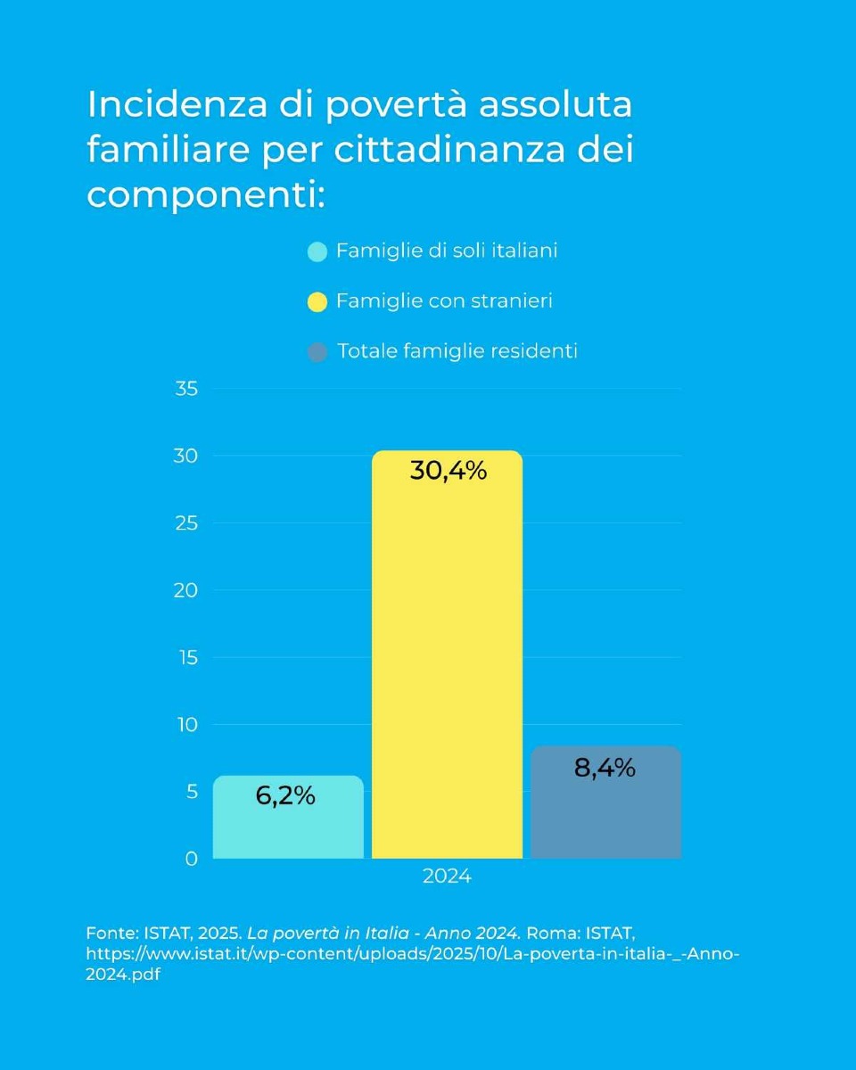 Le condizioni socio-economiche sono particolarmente svantaggiose per le famiglie con cittadinanza non italiana: se si considerano le famiglie composte solamente da italiani, l’incidenza di povertà si attesta all’8,0%, mentre diventa cinque volte più elevata (40,5%) per quelle composte unicamente da stranieri (255mila famiglie). L'incidenza di povertà assoluta è del 33,6% nel caso di famiglie con minori composte da membri sia italiani sia stranieri (338mila nuclei).