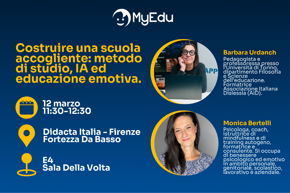 Giovedì 12 marzo alle ore 11:30 (presso il padiglione E4, Sala della Volta) si terrà l’incontro “Costruire una Scuola accogliente: metodo di studio, intelligenza artificiale ed educazione emotiva” a cura della professoressa Urdanch e della dottoressa Bertelli, esperte del Comitato Scientifico di MyEdu, casa editrice digitale, nella cornice fiorentina di DIDACTA ITALIA, la più importante manifestazione dedicata alla formazione e all’innovazione del mondo della scuola.