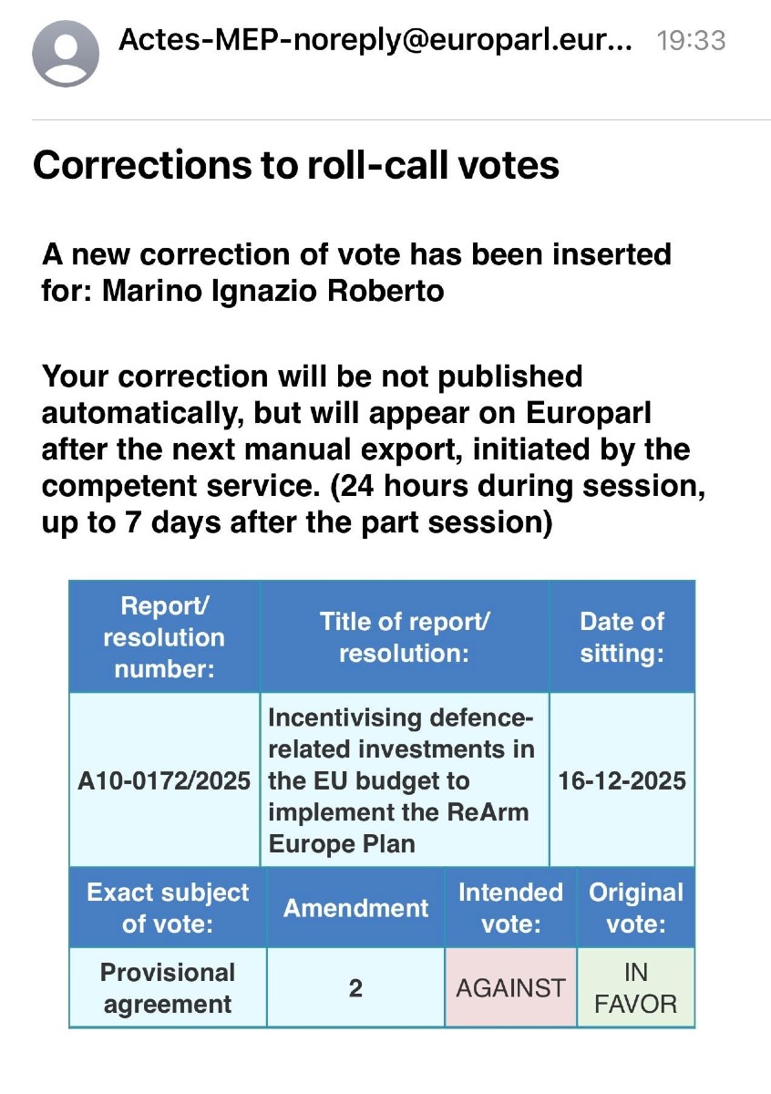 Ecco cosa ci scrive Ignazio Marino in un comunicato giunto in redazione: 'Desidero precisare che tale indicazione non corrisponde alla mia posizione politica né al mio voto effettivo. Il voto favorevole attribuitomi è stato il risultato di un errore meramente meccanico nel sistema di voto elettronico durante la sessione plenaria di Strasburgo. Come previsto dal regolamento del Parlamento europeo, ho immediatamente avviato e completato la procedura ufficiale di rettifica del voto, che è stata regolarmente registrata dal sistema dell’Eurocamera. Il mio voto corretto è contrario.
