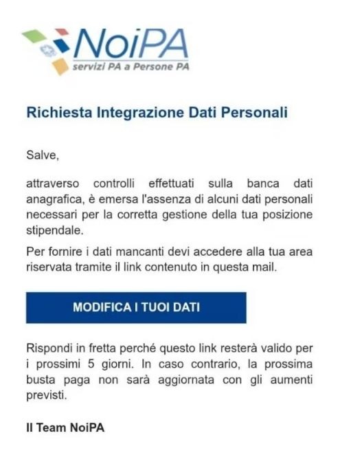 Una sofisticata truffa NoiPA sta circolando rapidamente, prendendo di mira i dipendenti della Pubblica Amministrazione. Attraverso una comunicazione ingannevole, i cybercriminali tentano il furto di dati sensibili e credenziali bancarie. La mail fa leva sulla falsa necessità di aggiornare l'anagrafica per non perdere gli aumenti stipendiali. È cruciale ignorare questo falso servizio clienti e adottare subito le dovute contromisure.